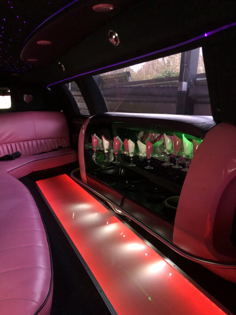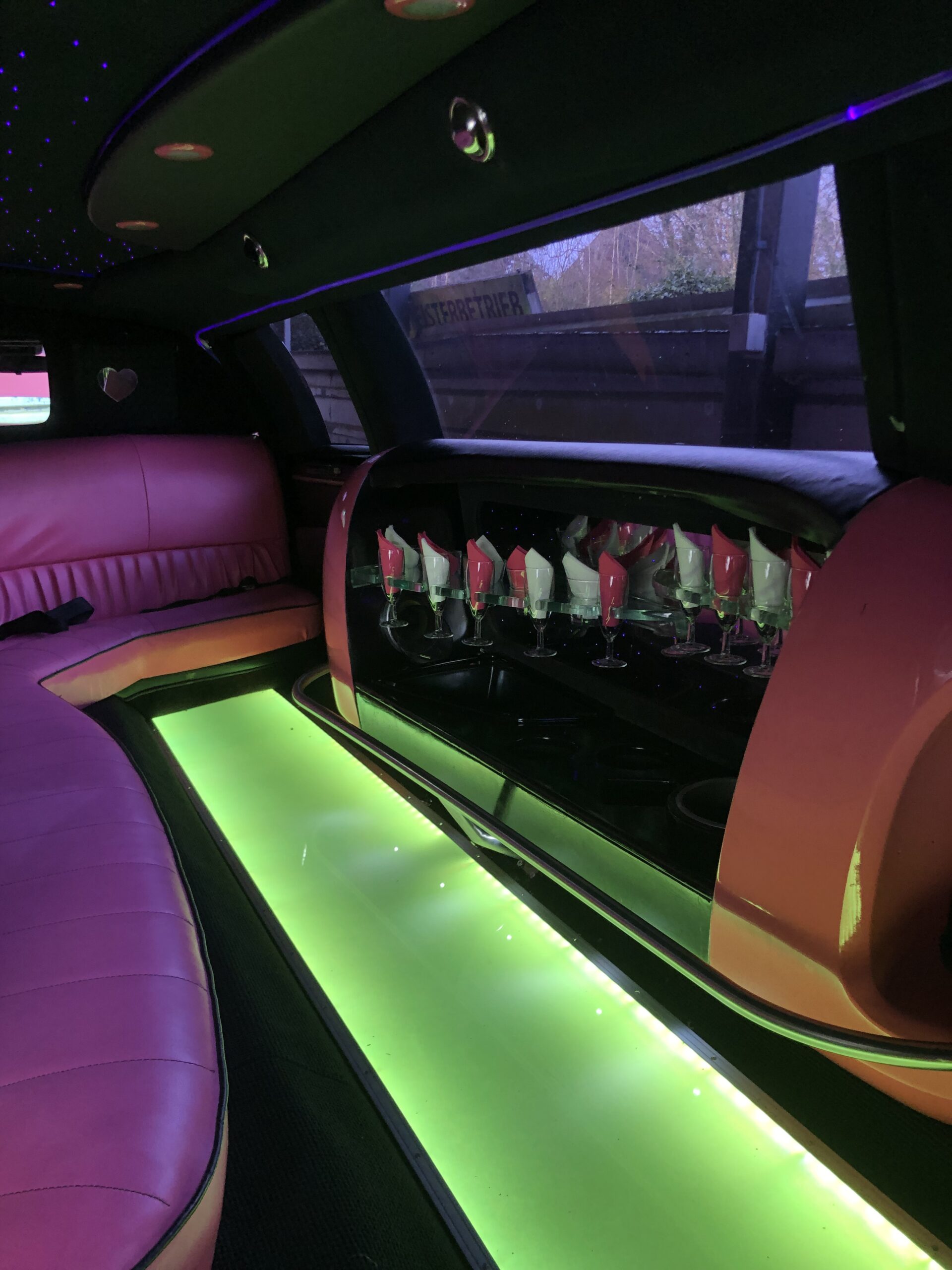 Welchen Event oder Party Sie mit einem besonderen Eye Catcher aufwerten wollen, sei es der Jungesellinnenabschied, eine Ladies-Night oder als V.I.P. Limo : Die pinkfarbene Grand Dame mit ihrer anmutigen Erscheinung und dem kompromisslosen Style ist eine unserer beliebtesten Stretchlimousinen für ganz besondere Momente. Bis zu 8 Fahrgäste finden in dem modernen Innenraum mit pinken Interieur Platz und geniessen die Fahrt mit Drinks aus der beleuchteten Bar bei Ihrer Wunschmusik.